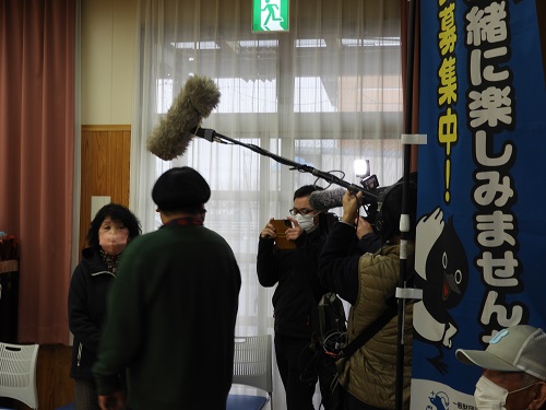 中川どっぺる氏(吉本興業:メガモッツ)の軽快なレポートと会員の方々との楽しい会話のラリーにより、順調に撮影が行なわれました。今回ご協力いただいた西与賀校区老人クラブ連合会の香月会長をはじめ、役員の皆様、会員の皆様、西与賀公民館の職員の皆様、ありがとうございました。